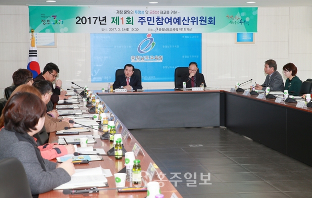 충남도교육청(교육감 김지철)은 지난 3일 주민참여예산위원 40명이 참석한 가운데 ‘2017년 제1회 주민참여예산위원회’를 개최했다.<사진>