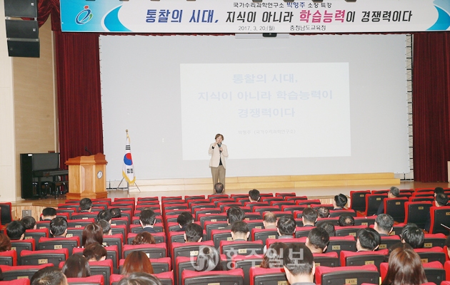 충남도교육청(교육감 김지철)은 지난 20일 본청 대강당에서 전 직원이 참여한 가운데 ‘통찰의 시대. 지식이 아니라 학습능력이 경쟁력이다’ 라는 주제로 박형주 국가수리과학연구소장을 초청해 특강을 실시했다.<사진>