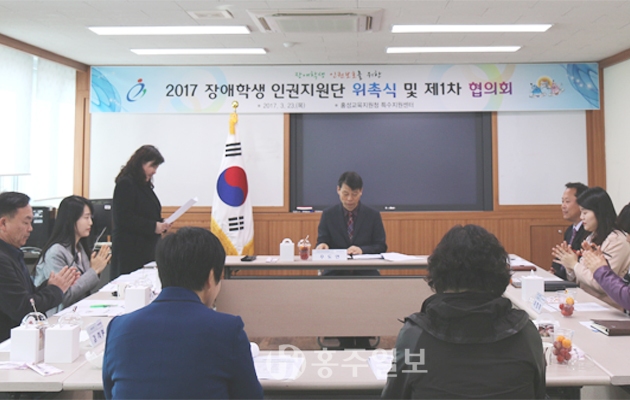 홍성교육청(교육장 고옥심)은 지난 23일 특수교육지원센터 연수실에서 각 분야 전문위원 11명이 참석한 가운데 2017학년도‘홍성 장애학생 인권지원단’ 위촉식 및 협의회를 실시했다.