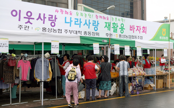 이날은 홍성농협주부대학총동창회(회장 맹은섭)주관, 홍성농협(조합장 박자흥) 후원으로 사계절 의류 및 생활용품, 우리 농산물과 먹거리를 저렴하게 판매하는 ‘이웃사랑 나라사랑 재활용 바자회’가 열렸다.