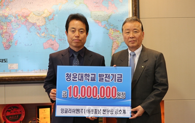 청운대학교는 지난 6일 잉글리쉬앤(주) 강호계 본부장이 이상렬 총장에게 대학발전과 인재양성을 위해 써달라며 천만원을 기탁했다.
