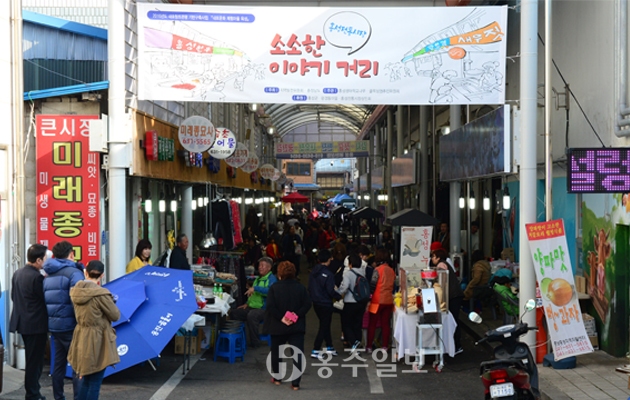전통시장은 예로부터 홍성, 보령, 예산, 청양 지역을 아우르는 오일장 형태로 통상 1일과 6일마다 장이 들어선다. 군은 그 넓은 공간 중 한자리를 지정해 “소소한 이야깃거리”라는 주제로 지난 15일부터 매주 토요일 오전 11시부터 오후 5시까지 주말장터 전성시대를 개장해 많은 이들의 이목을 끌고 있다.
