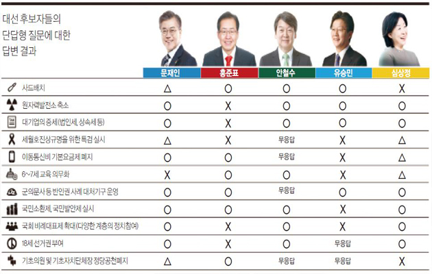 ‘대기업에 대한 증세’를 묻는 질문엔 문재인·안철수·유승민·심상정 후보는 찬성했고, 홍준표 후보는 반대했다. ‘기초의원 및 기초자치단체장에 대한 정당공천 폐지’에는 홍준표 후보 찬성, 심상정 후보 반대, 문재인 후보 검토, 안철수·유승민 후보는 응답하지 않았다.