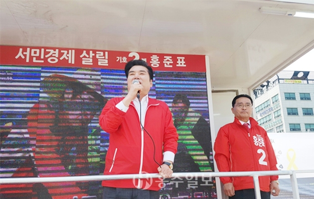 이어 “홍준표 후보는 엄중한 안보 상황에 사드 배치를 해야 한다고 주장하고 있다. 홍준표 후보는 뼛속까지 서민이고, 중앙과 지방의 행정을 잘 아는 후보다. 대한민국을 활짝 열어갈 안보 대통령, 당당한 서민 대통령 홍준표 후보를 선택해달라”고 호소했다. 이 자리에 함께 참석한 이인제 전 의원은 “지금은 국민이 세운 박근혜 대통령이 강제로 끌어내려 왔고 차가운 감옥에 갇혀있다. 4월은 잔인한 계절이 분명하다. 한심한 양당 구도에 속으면 안 된다. 탄핵 폭풍 때문에 보수 우파를 사랑하는 분들을 실망하게 해서 정말 죄송하다”고 말했다.