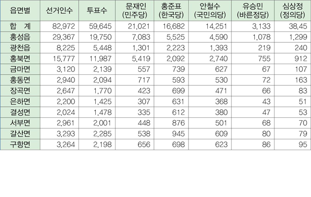 이번 대선에서 홍성읍은 2만9367명중 1만9750명이 투표에 참여해 67.25%의 투표율을 보였으며, 광천읍이 8225명중 5448명이 투표해 66.24%, 홍북면이 1만5777명중 1만1987명이 투표해 75.98%로 홍성군 최고의 투표율을 나타냈다. 금마면 68.56%, 홍동면 71.22%, 장곡면 66.87%, 은하면 64.77%, 결성면 73.02%, 서부면 67.58%, 갈산면 69.39%, 구항면 67.34%의 투표율을 보인 것으로 각각 집계됐다.