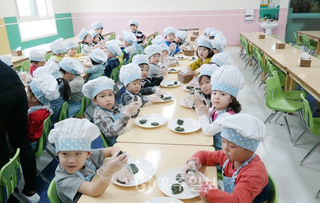 내포유치원(원장 지경옥)은 지난달 28일 급식실에서 전체 원아를 대상으로 ‘쑥떡 만들기’ 요리 활동을 실시했다. 내포유치원 관계자들은 유아들이 쑥과 쌀을 이용한 요리체험을 통해 봄을 느끼고 우리 쌀의 다양한 먹거리를 이해하길 바라며 이번 체험을 계획했다. 그리고 유아들의 건강한 식습관을 형성하기 위한 요리활동을 실시했다.
