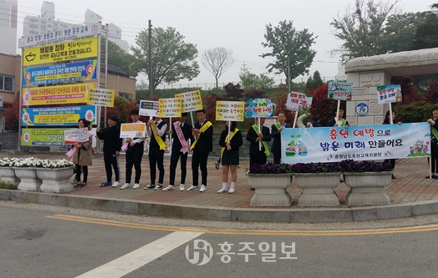 홍성교육지원청(교육장 고옥심)은 지난 1일 홍주고등학교 정문 앞에서 홍주고등학교 교직원 및 학생 등 60여명이 참여한 가운데 학교 폭력예방 및 흡연예방 캠페인을 실시했다.