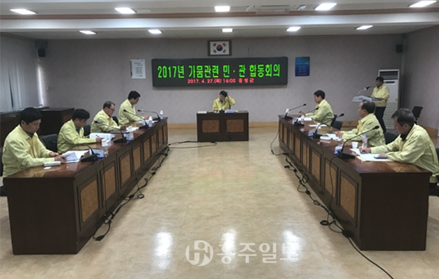 홍성군은 연일 지속되는 가뭄 극복을 위해 지난달 27일 홍성군수 주재하에 가뭄관련 민‧관 합동희의를 개최 했다. 군은 4월 현재 강수량이 95㎜로 평년대비 56%에 그치고 있으며 4월 기상청 예보 결과 홍성군 농업용수, 생활 및 공업용수는 ‘주의’의 가뭄위기경보를 보이고 있다. 특히 홍성군에서 식수로 사용하는 보령댐의 담수율은 13.2%로 경계단계에 진입했다.