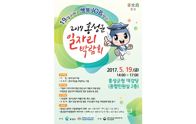 홍성군에서는 우수인재들에게 취업의 기회를 제공하고 지역 기업의 인력난 해소를 위해 오는 19일 오후2시부터 5시까지 군청 대강당에서 ‘19(일구)하고 행복 JOB(잡)는 2017 홍성군 일자리 박람회’를 개최한다.