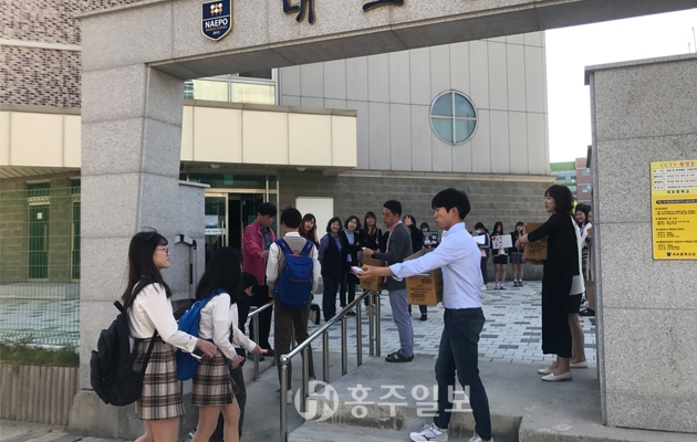 충남도청내포신도시의 내포중학교(교장 조국행)는 지난 15일 스승의 날을 맞이해 교사들이 정문과 후문에서 등교하는 학생들을 맞이하는 ‘행복등교맞이’ 행사를 가졌다.