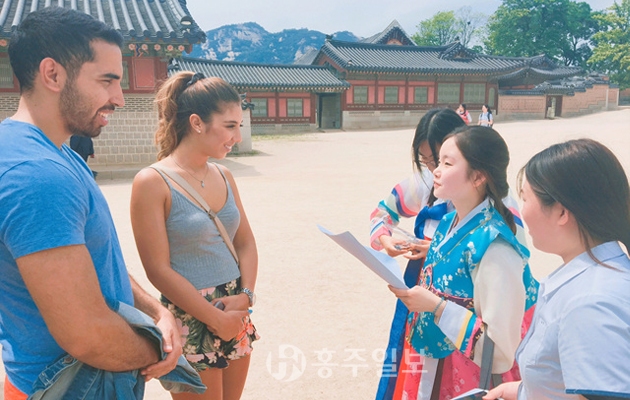올해 4년째를 맞이하는 ‘제5차 Royal Palace 한복 캠페인’을 위해서였다. 이 캠페인은 우리나라 고궁을 방문한 외국인 관광객을 대상으로 한복의 아름다움을 알리고, 독도 문제, K-POP 등의 한국 문화에 대한 외국인들의 인식을 조사하기 위해서다. 이를 조사하기 위해 학생들이 직접 인터뷰할 내용을 영작하고, 한국을 알릴 수 있는 선물을 준비해 활동하는 캠페인이다.