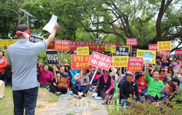 지난달 31일 양계장 신축 반대시위가 군청 앞에서 열렸다. 이날 시위에는 결성면 성남리 신리마을(이장 최진구)을 포함한 은하면 2개 마을과 결성면 3개 마을 주민 200여 명이 참석해 양계장 신축 허가를 철회할 것을 촉구했다.