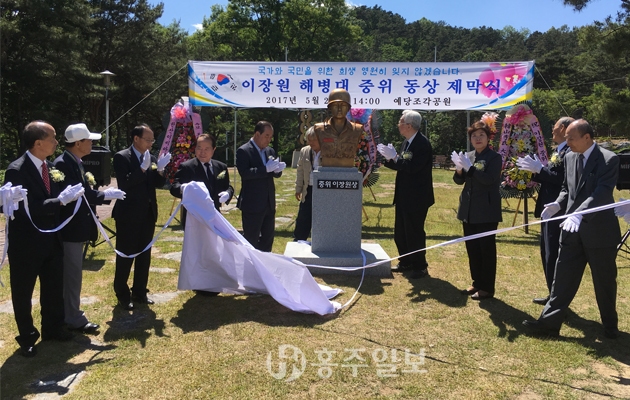 충남서부보훈지청(지청장 안기선)은 지난달 26일 예산군 예당호조각공원에서 호국영웅 이장원 중위의 희생과 공헌을 기리기 위한 흉상을 건립해 제막식을 가졌다.