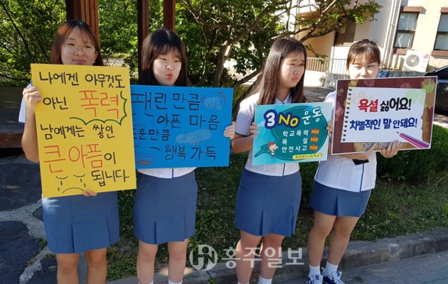 또한 ‘캡스’는 지난달 26일 고운 말, 바른 말 사용에 앞장서 행복한 학교 만들기를 취지로 학교폭력예방 캠페인을 실시했다. 직접 만든 글귀와 표어, 피켓 등을 만들어 학교폭력 예방교육을 다양한 초점으로 다가갔다. 학생들이 어려워하는 학교폭력예방 교육에 쉽게 접근할 수 있도록 ‘학교폭력NO, 욕설NO, 안전사고NO’ 라는 ‘3NO운동’으로 캠페인을 통한 즐거움과 기쁨을 주는 계기가 됐다. 등굣길을 이용해 537명의 홍성여고 학생들이 많은 관심을 보여 성황리에 캠페인을 마쳤다.
