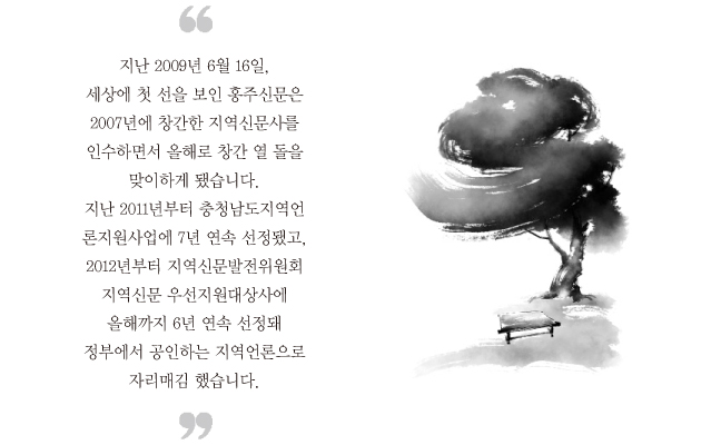 지난 2009년 6월, 세상에 첫 선을 보인 홍주신문은 2007년에 창간한 지역신문사를 인수하면서 올해로 창간 열 돌을 맞이하게 됐습니다. 창간 3년차인 지난 2012년부터 문화체육관광부·한국언론진흥재단·지역신문발전위원회의 지역신문 우선지원대상사에 선정, 올해까지 6년 연속 선정돼 정부에서 공인하는 지역언론으로 자리매김 했습니다. 국가 공인기관인 한국ABC협회에서 평가한 ‘2016년도 주간신문부수 공사보고서’에는 홍주신문의 발행부수가 3875부로 전국의 지역신문 중에서 유료부수 77.15%로 전국 17위, 지역신문발전위원회 우선지원선정사 중 11위, 충남지역신문 중 4위를 차지하는 결과로 조사됐습니다. 또한 2011년부터 충청남도 지역언론지원사업에 7년 연속 선정된 영예는 애독자와 주민여러분들이 홍주일보 홍주신문에 보내주신 따뜻한 관심과 격려, 따끔한 질책과 사랑의 결과입니다. 창간 10년 만에 전국 10위권의 지역신문으로 성장하기까지 늘 독자여러분들이 희망이었고, 또 함께 동행하는 동반자였습니다. 거듭 진심으로 감사드리면서 앞으로도 정직과 신뢰, 반듯한 양심으로 최선의 노력을 다하겠다는 약속을 드립니다.