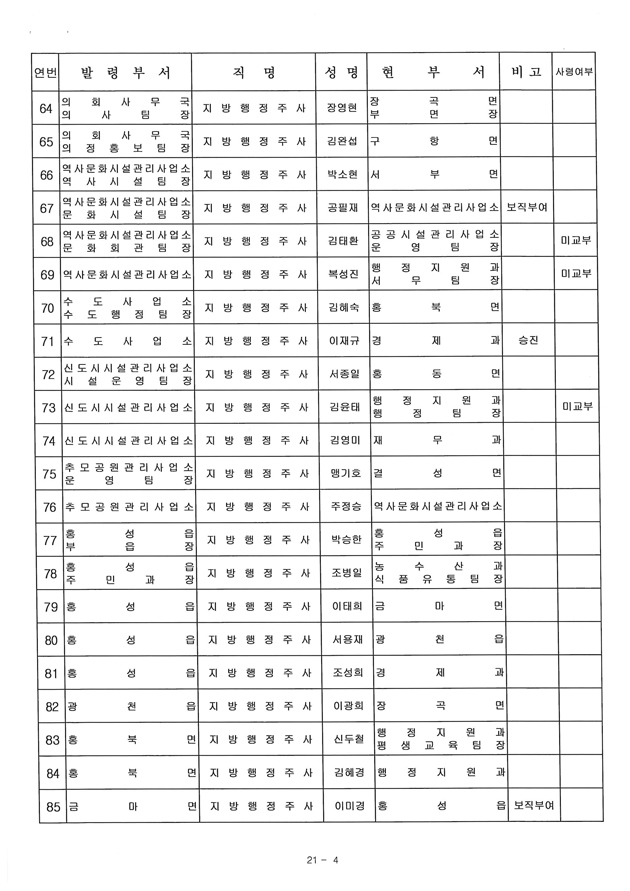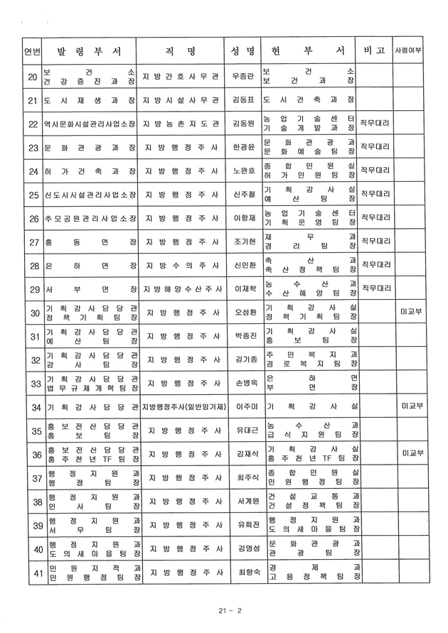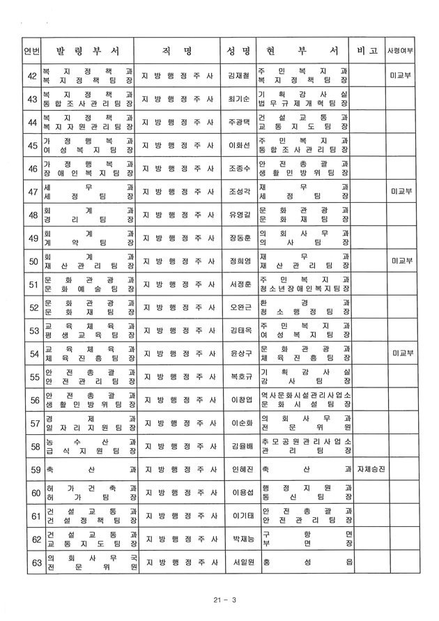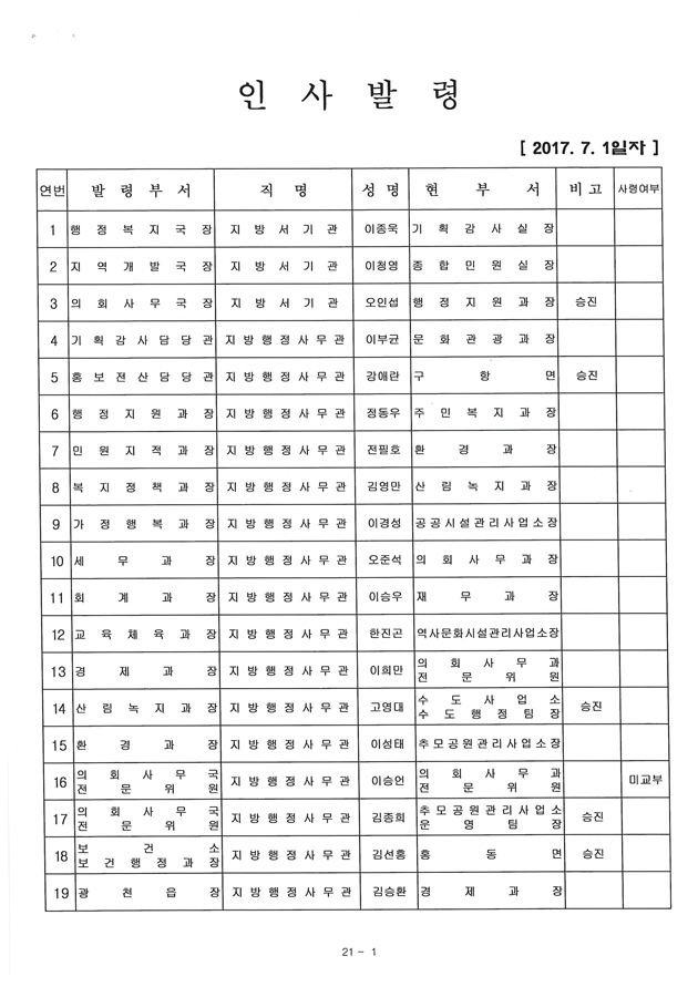 아울러, 지역주민들의 관심이 집중된 조직개편으로 만들어진 국장자리는 행정복지국장에 이종욱 기획감사실장, 지역개발국장에 이청영 종합민원실장이 자리를 옮겼고, 4급으로 격상된 의회사무국장에는 오인섭 행정지원과장이 승진 임명됐다.