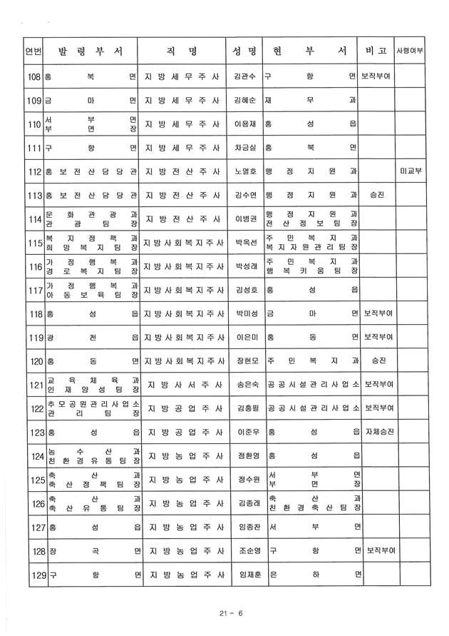 홍성군이 7월 1일자로 대규모 인사발령을 단행했다. 홍성군 공무원 정원의 50%가 넘는 최대 규모인 488명에 대한 인사다. 군에 따르면 그동안 공직사회에서 불만의 목소리가 있던 소수직렬 6급 승진에 대한 해소를 위해 승진자의 76%를, 7급의 경우 56%를 소수직렬에서 발탁하는 파격적인 인사를 단행한 것이 특징이다.