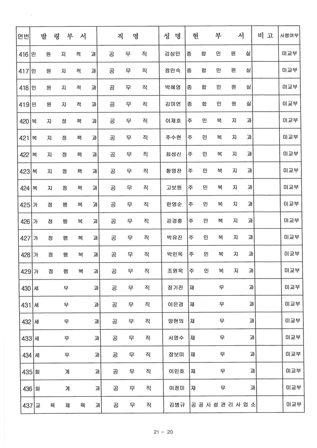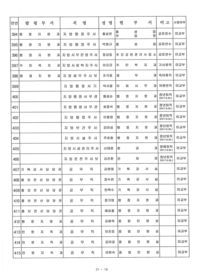 이번 인사는 조직개편으로 인한 정원증가와 퇴직자와 휴직자 등으로 발생하는 결원(예정)에 대한 승진과 충원을 위한 인사로 4급(국장급) 3명을 비롯해 406명이 새로운 자리로 옮기며, 71명에 대한 승진도 함께 진행됐다.