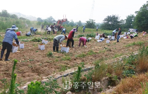 홍북면(면장 이환식)에 따르면 농촌지도자회 70명은 올해 1월부터 홍북면 대동리에 농지 4000㎡를 임차해 감자, 고구마를 심고 관리해왔으며, 지난 26일 홍북면새마을부녀회 회원들과 함께 무더운 날씨에도 불구하고 ‘사랑의 감자’를 수확해 10Kg짜리 300박스를 생산했다.