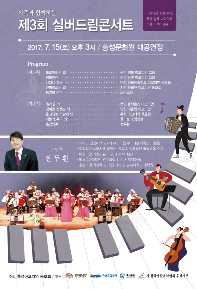 홍성아코디언 동호회가 주최하고 충청남도, 충남문화재단, 홍성군, 사)한국생활음악협회 홍성지부가 후원하는 ‘가족과 함께하는 실버드림콘서트’가 오는 15일 오후 3시에 홍성문화원 대공연장에서 공연된다. 입장비는 무료이며, 총 2부의 순서로 진행된다.