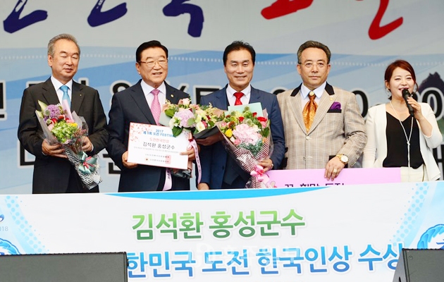 김석환 군수가 지난 8일, 서울 어린이 대공원 능동숲속의 무대에서 진행된 ‘2017 대한민국 도전 한국인상 시상식’에서 유기농업 경쟁력 및 축제발전에 기여한 공로를 인정받아 ‘도전 한국인상’을 수상했다.