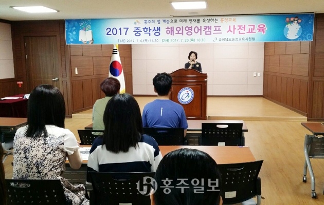 홍성교육지원청(교육장 고옥심)은 지난 6일 홍성교육지원청 대회의실에서 2017 홍성교육지원청 중학생 해외영어캠프에 참가하는 학생 25명과 학부모를 대상으로 사전교육을 실시했다.