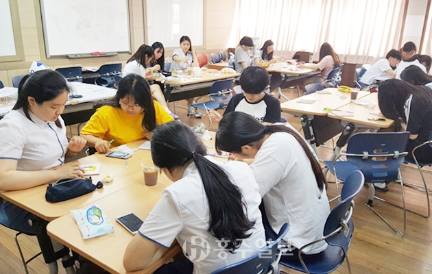 통일교육 선도학교인 홍성여고(교장 유병대)가 평화통일답사에 이어 통일캠프 두 번째 체험 행사로 지난 13일 학생·학부모가 함께하는 ‘통일타일 만들기’ 행사를 개최했다.<사진>