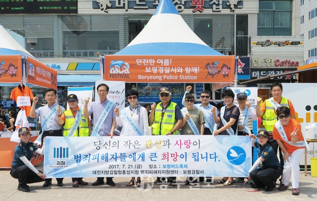 (사)홍성지역범죄피해자지원센터(이사장 최헌숙)는 피서철을 맞이해 지난 21일 대천해수욕장 머드축제장에서 관광객을 대상으로 범죄피해자 인권 보호 캠페인을 펼쳤다고 밝혔다. 이날 캠페인은 범피회원과 보령경찰서 직원 합동으로 실시됐다. 저작권자 © 홍주일보 무단전재 및 재배포 금지 홍주일보 다른기사 보기 페이스북 카카오톡 URL복사 기사공유하기