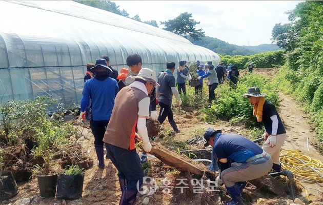 홍성군은 지난달 14일부터 16일까지 집중호우에 의한 수해 피해로 어려움을 겪고 있는 천안시 피해농가에 지난달 26일 홍성군청 공무원 등 40여명을 지원해 피해 복구에 나섰다고 밝혔다.<사진>