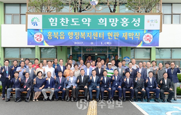 지난 1일 오전 10시 내포신도시가 내려다보이는 홍북읍사무소에서는 김석환 홍성군수를 비롯해 김덕배 홍성군의회 의장, 홍문표 국회의원 등 내빈과 주민 100여명이 참석한 가운데 읍행정복지센터 현판제막식이 있었다.