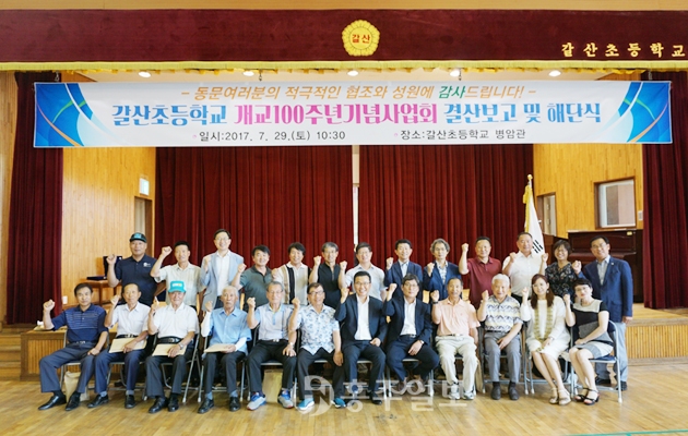 갈산초등학교 개교100주년기념사업회 김정주 회장은 격려사를 통해 “동문들의 적극적인 협조로 당초 세웠던 목표액을 넘어 성공적인 행사를 치를 수 있었다”며 “개인의 노력이 아닌 동문 전체의 단합된 모교사랑과 동문 화합으로 함께 노력해 이뤄낸 결과이기에 더욱 감동스럽다”고 소감을 전했다.