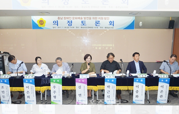 김연 의원이 좌장을, 우주형 나사렛대 교수가 관련 주제를 발표했다. 또 박근식 꽃다지장애인합창단 지휘자와 이은희 충남장애인창의문화예술연대 대표, 이종화 충남도의원, 조민두 장애인문화예술축제 리날레 총감독, 이존관 도 문화정책과장이 토론자로 나섰다.
