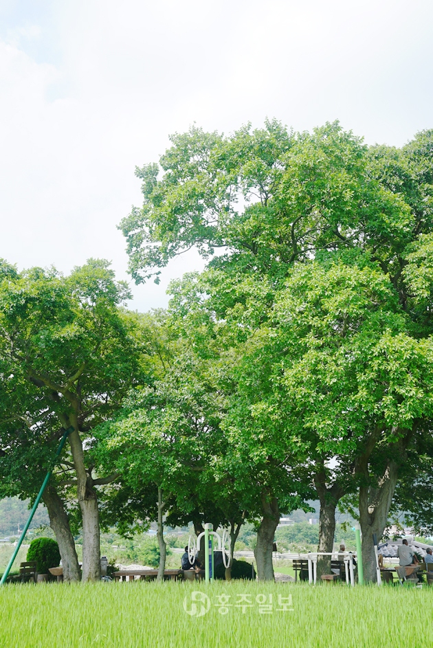 갈산면 행산리 311-1 백야 김좌진 장군 사당 앞 논 한가운데에 있는 팽나무 다섯 그루는 1982년 10월 보호수(지정번호 8-12-10-8-317)로 지정된 나무다. 수령은 210여년 이상 되며, 나무둘레 2.3m, 수고 14m 가량 된다. 갈산면 행산리 주민들이 관리하는 이 보호수는 대부분 한 그루씩 지정된데 비해 다섯 그루가 함께 모여 있어 한꺼번에 지정됐으며, 나무아래에는 주민들의 휴식공간으로 이용되고 있으며, 보호수 안내판과 각종 운동기구도 잘 갖춰져 있다.