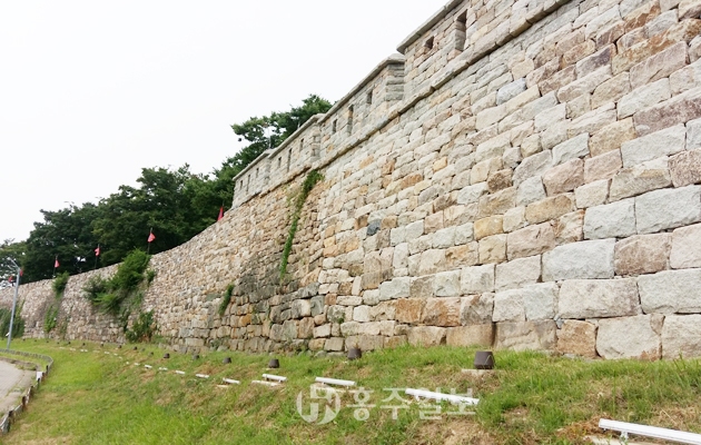 2014년 1월에 보고된 ‘홍성 홍주읍성 종합정비기본계획안’의 ‘여장 복원계획안’을 보면 여장은 남문을 중심으로 동서쪽 벽 222m에 53개, 서쪽 벽 285m에 68개를 설치하는 것으로 돼 있는데 실제 설치된 것은 현재 8개뿐이다. 당시 보고서에 여장 복원을 위한 소요사업비는 16억 원으로 산정돼 있다. 그러나 그 후 추진과정에서 부족한 예산 문제 때문이었는지 남문 좌우에 8개만 복원해 미완성된 성곽은 군민들의 안전을 위협하는 공원이 됐다.