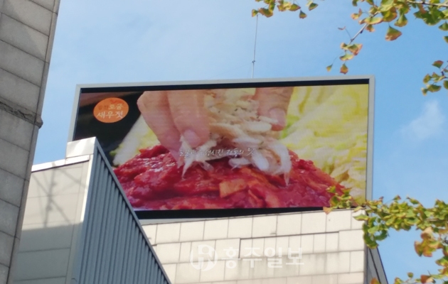 홍성군은 서울 마포구 서교동 지은빌딩과 금천구 독산동 신건빌딩 전광판 2곳에 8월부터 10월까지 3개월간 광천토굴새우젓 홍보 동영상을 송출하고 있다.<사진>