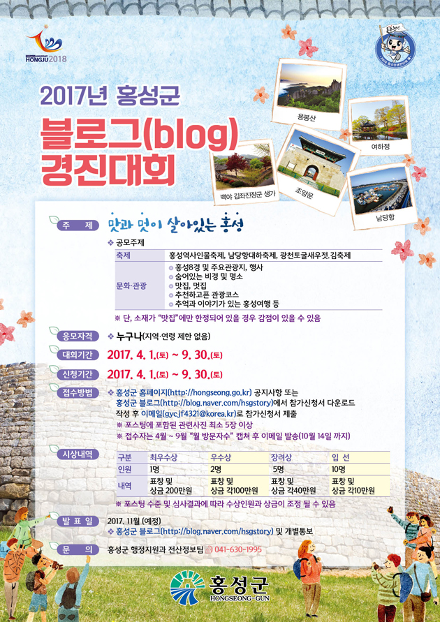 단, 기존 운영 중인 블로그는 대회기간(4월 1일~9월 30일) 동안 게시한 글만 평가에 반영되며, 카테고리는 ‘홍성’으로 분류해 운영해야 한다. 성역사인물축제, 남당항 대하축제, 광천토굴새우젓·광천김 대축제 등 군을 대표하는 축제는 물론 홍성 8경, 관광지, 숨어있는 명소, 맛집, 추천하고 싶은 관광코스까지 자유롭게 게재할 수 있다.