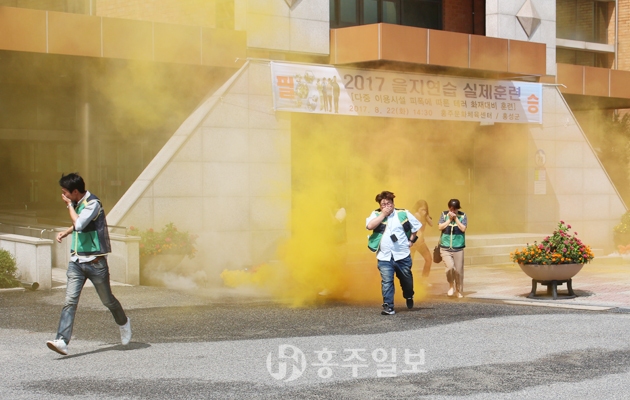 홍성군은 지난 22일 홍주문화체육센터에서 8개 기관 단체에서 250여 명이 참석한 가운데 2017년 을지연습 실제 훈련인 다중이용시설 피폭에 따른 테러 화재 대비훈련을 실시했다.