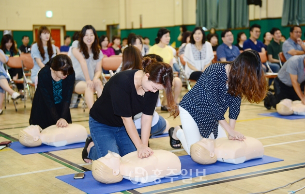 홍성군보건소(소장 조용희)는 지난 21일 천안단국대학교에 위탁해 홍성초등학교 교사 및 지역자활센터 간병인들을 대상으로 심폐소생술 및 응급처치 교육을 실시했다고 밝혔다.<사진>