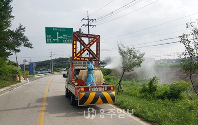 군은 앞서 주요 도로변, 국도 21호 외 22개 노선, 공원녹지 지역 등 산림병해충 발생이 예상되는 지역 내 가로수에 방제를 완료한 바 있다. 연중 지속적인 병해충 예찰을 위해 예찰단 5명을 운영 중에 있고 홍동면은 유기농업 지역인 만큼 친환경 약제를 살포한 바 있다.