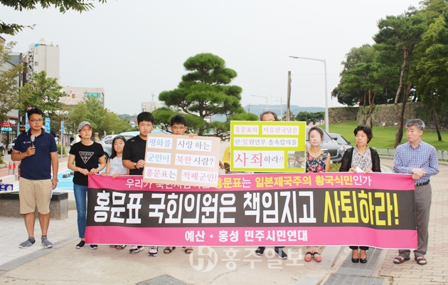예산·홍성 민주시민연대 회원들은 지난 18일 평화의 소녀상 앞에 모여 홍문표 국회의원 홍성평화의 소녀상 제막식 발언 규탄 기자회견을 가지면서 공인으로서 언행을 사과하고 의원직을 사퇴할 것을 요구했다. 저작권자 © 홍주일보 무단전재 및 재배포 금지 홍주일보 다른기사 보기 페이스북 카카오톡 URL복사 기사공유하기