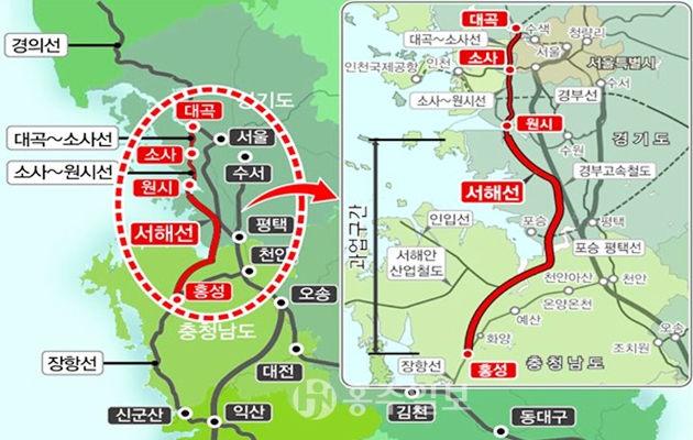 홍성에서 경기도 화성 송산까지 약 90km(충남도내 43㎞)구간을 철도로 연결하는 서해선 복선전철 사업은 지난 2015년 5월 21일 홍성역에서 기공식을 갖고 본격 공사에 들어갔다. 2020년 완공을 목표로 총 사업비 3조 8280억 원이 투입되는 서해선 복선전철에는 기존 새마을호에 비해 속도가 1.6배정도 빠른 시속 250km급 고속 전철(EMU-250)이 운행돼 서울까지 1시간대 이동이 가능할 전망이다.
