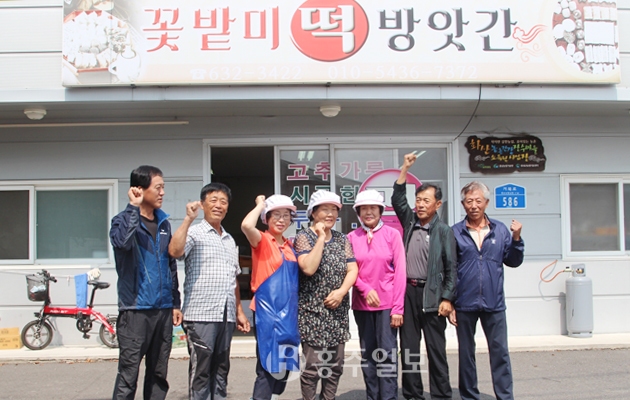 그 다음은 떡방앗간을 통한 수익사업으로 농촌 할머니들을 위한 일자리 창출에 성공한 케이스로 꼽을 만 했다. 구항면에서 은하면 방면 지방도로에서 화산마을로 들어가는 입구에 ‘꽃밭미떡방앗간’이 있는데, 황윤도 부녀회장을 비롯해 4명의 할머니가 일하는 어엿한 직장이었다. 지금 추석을 3주 가량 앞두고 송편 빚기에 여념이 없었다. “농업기술센터에서 농촌건강장수마을‘로 지정돼 연 5000만원씩 3년에 걸쳐 지원받아 하는 노인회 소득사업으로 부녀회가 운영하고 있습니다.”