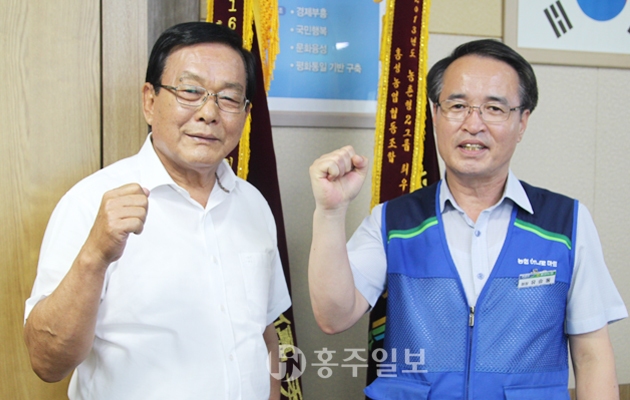 농협하나로마트의 수익금은 지역사회 환원을 위한 것이라고 강조하는 정해명 조합장(왼쪽)과 유승동 지점장.