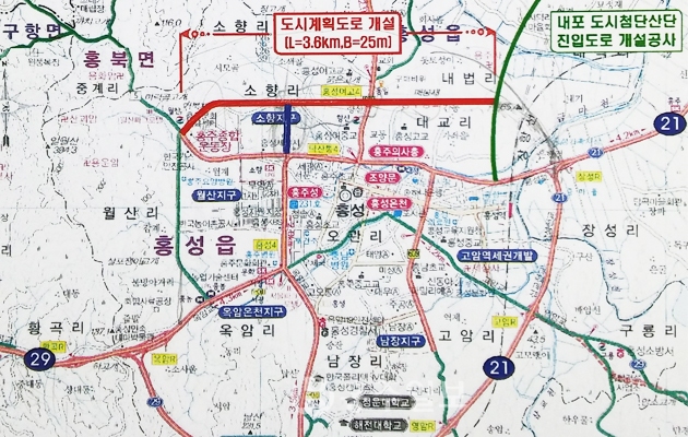 도시재생과에서는 내법리에서 홍주종합운동장까지 이어지는 도시계획도로를 200억 원의 예산을 들여 내년 2월경에 착공에 들어갈 계획이라고 밝혔다.