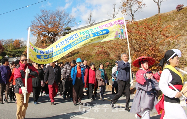 시각장애인 100여 명이 홍주문화회관에서 오페라웨딩홀까지 1.3km 재활증진을 위한 걷기대회를 실시했다.