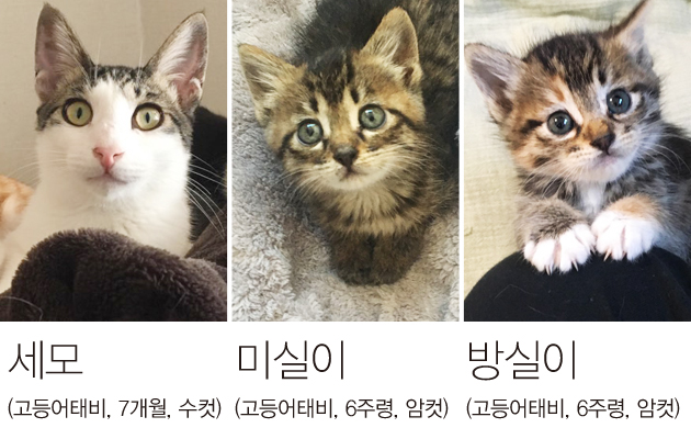 미실이와 함께 구조된 호기심 많고 장난치기 좋아하고 열심히 뛰어다니는 것을 자신의 천직으로 아는 건강한 아기고양이입니다. 역시 실내묘이고, 외롭지 않게 이미 고양이가 있는 집으로 가거나 미실이와 함께 입양가길 희망합니다.
