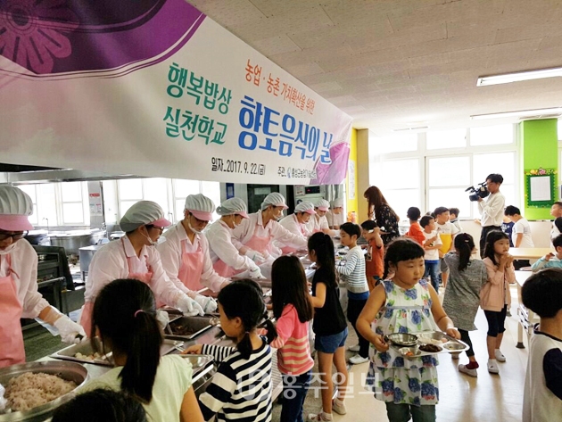 군내 갈산초등학교를 비롯한 금마초, 홍동초, 홍성초 등 4개 학교 학생 1825명이 참석한 이번 행사에서는 지역 농축산물을 활용한 오색쌀밥, 아욱된장국, 쇠고기 두부찜, 대왕버섯 채소볶음, 배추김치, 꿀떡 등이 급식으로 제공됐다.