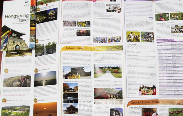 외국인을 위해 홍성군의 관광지를 소개하는 영문 리플릿이 있다. ‘Hongseong Travel’이라는 제목의 이 리플릿은 가로 58cm, 세로 42cm 크기의 고급 아트지를 여러 겹 접어서 수첩 크기로 줄여 호주머니에 휴대하기 좋도록 돼 있는데, 넓게 펼치면 앞에는 계절별로 아름다운 풍경을 감상할 수 있는 군내 명소와 축제, 역사유적지, 특산물 등을 영문으로 소개하는 내용이 눈에 들어온다. 뒷면은 홍성군의 관광지도(Tourist Map of Hongseong)가 크게 확대된 그림으로서 주요 명소를 영문으로 지명이나 관련된 인물의 이름을 표시해 놓았다.