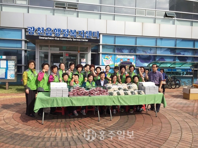 광천읍새마을부녀회는 명절은 물론 매주 화요일마다 4명이 한 조가 돼 김치, 생선, 고기, 과일 등 10여 가지 부식을 장만해 독거노인 11명에게도 정기적으로 지원하고 있다. 홍성군에서 이렇게 봉사하는 곳은 광천읍 새마을부녀회뿐이라고 한다. 매주 화요일 실시하는 독거노인 봉사행사는 군의 지원을 받으나 명절과 광천 새우젓 축제, 학교 동문회 행사, 군 주회로 하는 축제 때는 부녀회가 총동원해 식사제공 등 자급자족한다. 1회 비용만도 400여만 원이 든다고 한다.