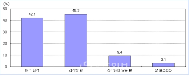 축산악취의 정도를 묻는 질문에서는 무려 87.4%에 이르는 주민들이 ‘매우 심각’하거나 ‘심각한 편’이라고 답한 것으로 조사됐다. 특히 내포신도시 주민들 90.2%가 ‘심각하다’거나 ‘매우 심각하다’고 답했으며, 홍성군 주민 88.7%도 ‘심각하다’거나 ‘매우 심각하다’고 답했다. ‘잘 모르겠다’고 답한 주민은 2.4~4.6%에 불과 했다. 남성 85.8%, 여성 90.2%가 ‘심각하다’거나 ‘매우 심각하다’고 답한 것으로 나타났다.